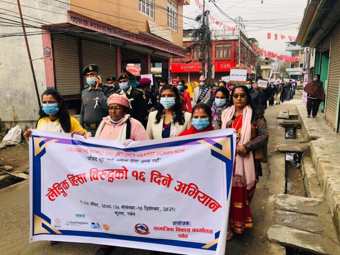 सामाजिक विकास कार्यालय पर्वतको आयोजना तथा इन्सेक, गैर स.स. महासंघ पर्वत, , गुडनेवर्सइन्टरनेशलन नेपाल सोडेक नेपाल को सहकार्यमा पर्वतमा लैङ्गिक हिंसा विरुद्धको १६ दिने अभियान शूरु गरिएको हो । अभियानको पहिलो दिन विहिवार पर्वतका विभिन्न कार्यालयका प्रमुख एवं कर्मचारी सहितसुरक्षाकर्मी,मानवअधिकारकर्मीहरुको सहभागिता रहेको थियो ।