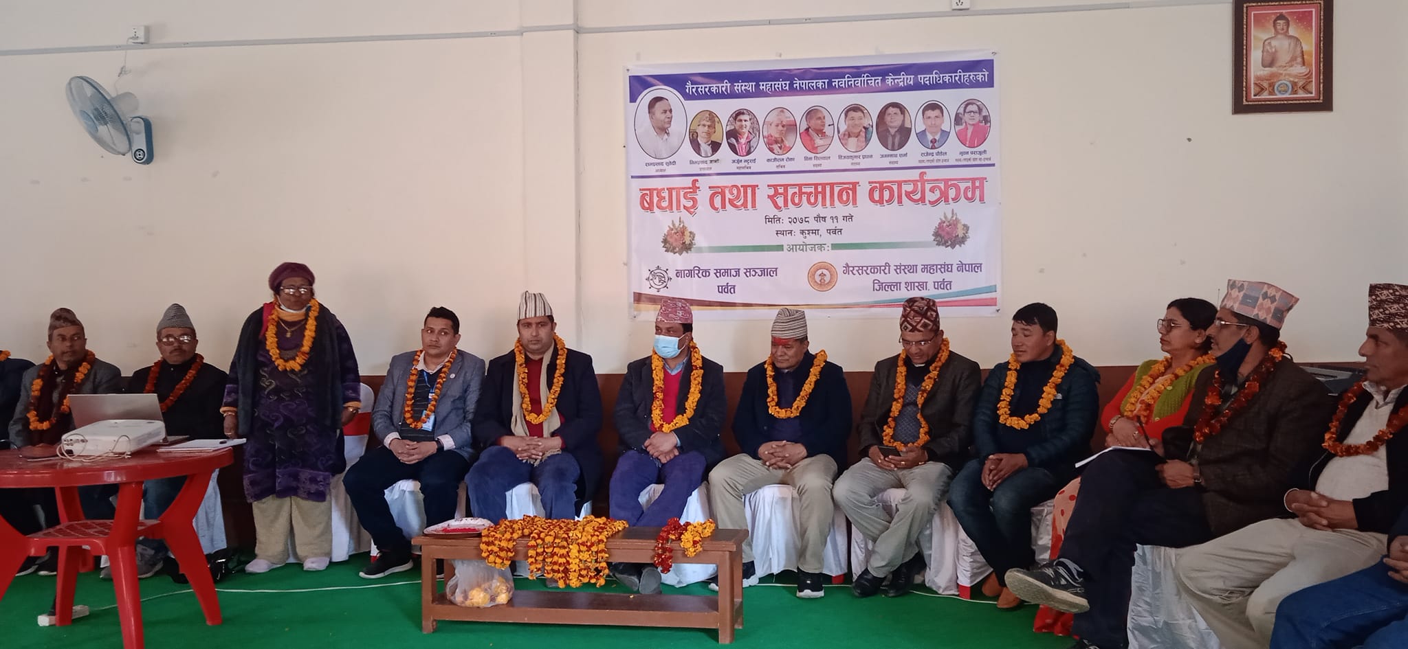पर्वतमा क्रियाशिल गैर सरकारी संस्था महासंघ नेपाल तथा नागरिक सञ्जाल पर्वतको संयूक्त आयोजनामा वधाई तथा सम्मान कार्यक्रम सम्पन भएको हो ।