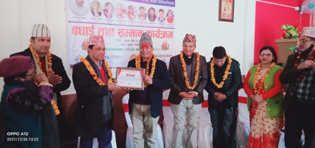 कार्यक्रममा केन्द्रिय अध्यक्ष राम प्रसाद सुवेदी महासचिव अर्जून भट्टराई, सचिव काजिमान रोका केन्द्रिय सदस्य विना सिलवाल ,विजय कुमार प्रधान ,जगन्नाथ पौडेल ,भुवन पराजुली र राजेन्द्र पौडेल, लाई सम्मान गरिएको थियोे ।
