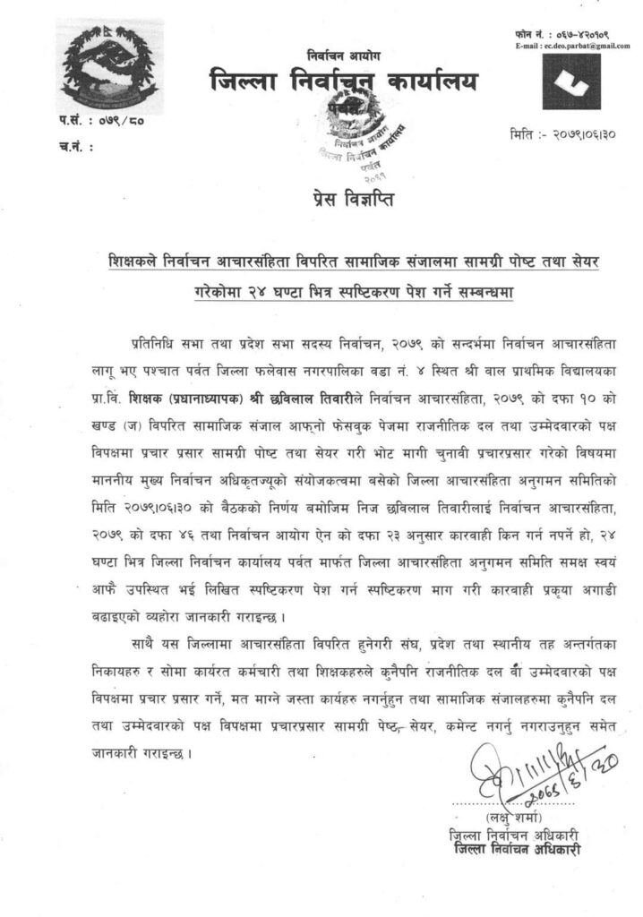 जिल्ला निर्वाचन कार्यालय पर्वतका जिल्ला निर्वाचन अधिकारी लक्षु शर्माद्वारा असोज ३० गते जारी विज्ञप्तिमा निर्वाचन आचार संहिता २०७९ को दफा ४६ तथा निर्वाचन आयोग ऐनको दफा २३ अनुसार कार्बाही प्रक्रिया अगाडि बढाउने गरी स्पष्टिकरण माग गरिएको उल्लेख छ ।