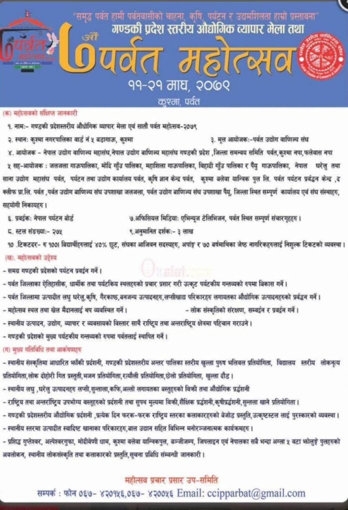 प्रमखु जिल्ला अधिकारी नारायण प्रसाद सापकोटाको अध्यक्षतामा सम्पन कार्यक्रममा स्वागत मन्तव्य जिल्ला आयूवेर्दीक कार्यालय पर्वतका नि प्रमुख रामकृष्ण भुजेलले गनूभएको थियो भने कार्यक्रमको संचालन प्रकाश चन्द्र सुवेदीले गर्नुभएको थियो ।