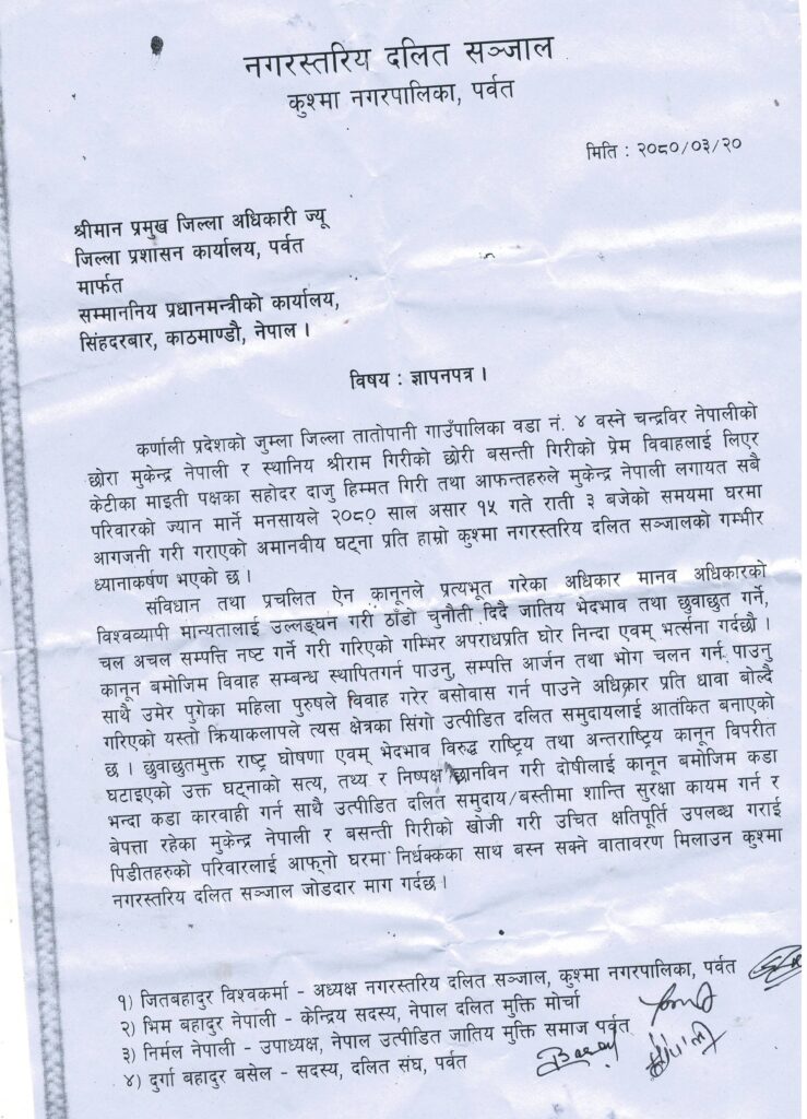 जूम्लामा अन्तरजातीय विवाहपछि घरमा आगजनी भएको विषयमा पर्वतका दलित संगठले आज दोषीलाई कडा कारवाही को माग गर्दै ज्ञापन पत्र वुभाएका छन् । पर्वतमा क्रियाशिल दलित संगठनहरुले प्रमुख जिल्ला अधिकारी मार्फत प्रधानमन्त्रिको कार्यालयलाई ज्ञापन पत्र वुझाएका हुन ।