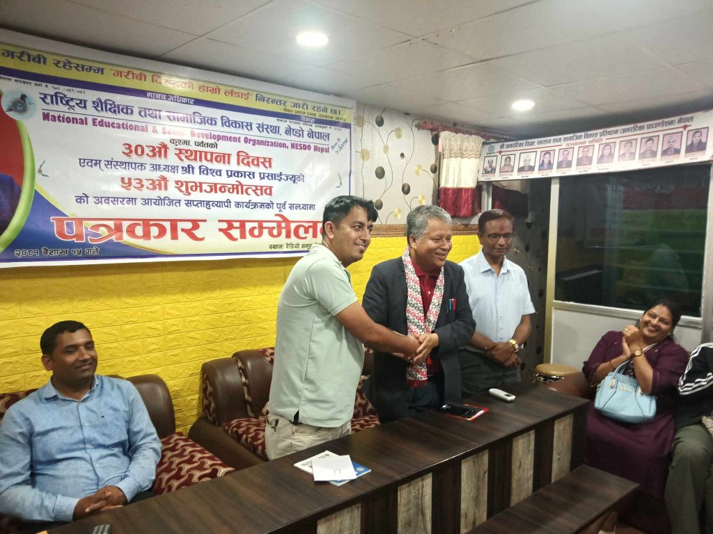 वैशाख १६ / पर्वत/ राष्ट्रिय शैक्षिक तथा सामाजिक विकास संस्था,नेष्डो नेपालको ३० औं स्थापना दिवसका अवसरमा सप्ताहव्यापी कार्यक्रम आयोजना गरिने भएको छ । संस्थाको स्थापना दिवस एवम् संस्थापक अध्यक्ष विश्व प्रकाश प्रसाइको ५३ औं जन्मोत्सवका अवसरमा वैशाख १६ देखि २२ गते सम्म विभिन्न सामाजिक कार्यक्रम आयोजना गरिएको पत्रकार सम्मेलन मार्फत जानकारी गराइएको हो ।