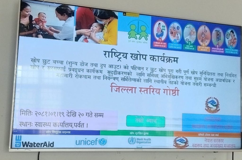 पूर्ण खोप सुनिश्चितता र सुदृढीकरण नियमित खोप तथा सरसफाइ प्रवद्र्धन कार्यक्रम तथा स्थानीय तहमा महामारी रोकथाम तथा नियन्त्रण का लागि वैशाख महिनाको अन्त सम्म जिल्लाका सवै वडा तथा स्थानिय तहरुलाई पुर्ण खोप सुनिश्चितता तथा दिगोपना कायम गर्ने योजना रहेको स्वास्थ्य कार्यालय पर्वतका प्रमुख प्रविण शर्माले जानकारी दिनुभयो ।