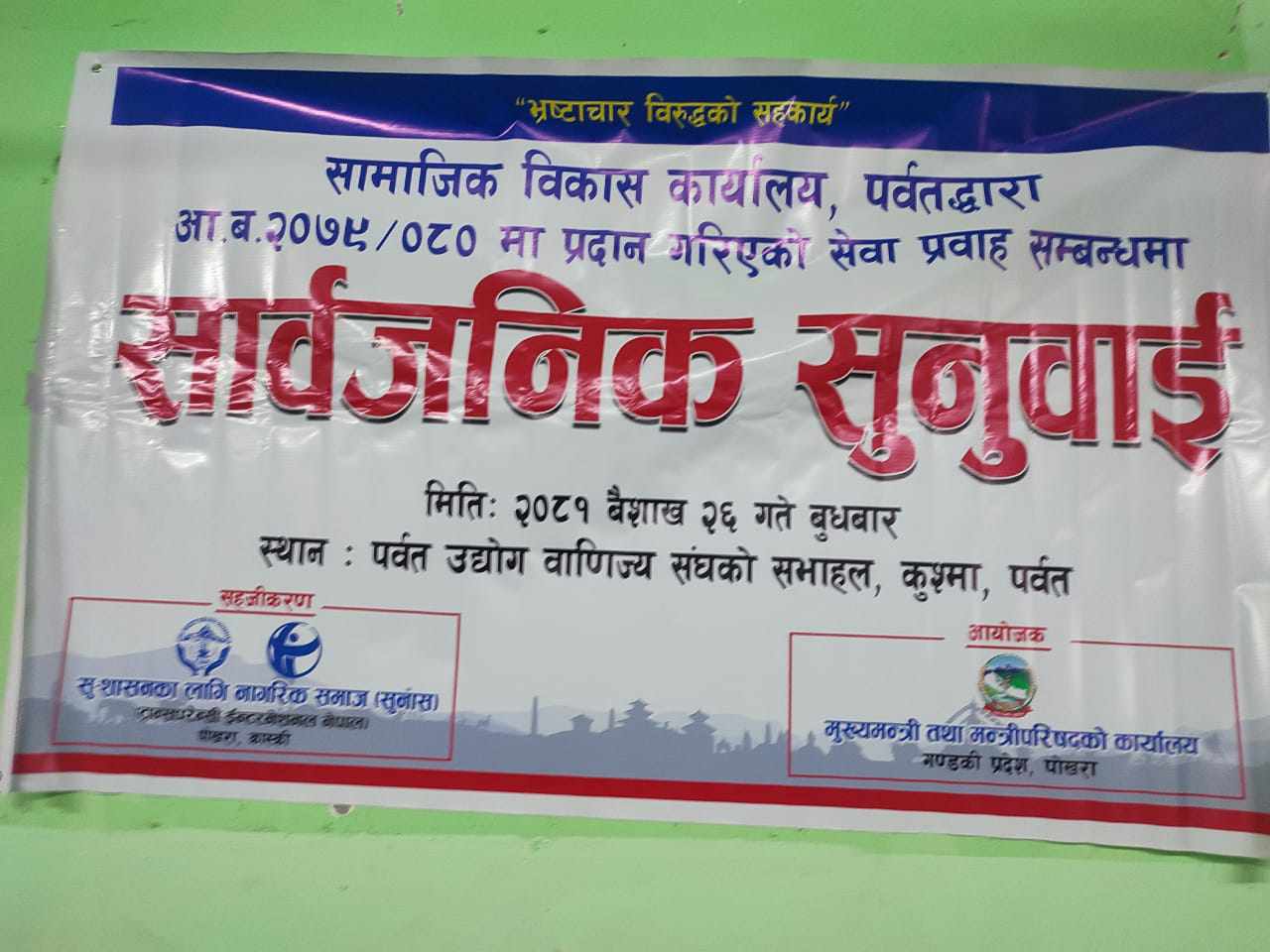सामाजिक विकास कार्यालय पर्वतका प्रमुख टंक प्रसाद ढकालको अध्यक्षतामा सम्पन्न कार्यक्रममा सुशासनका लागि नागरिक समाज टा्रन्सपरेन्सी नेपालको सहजिकरण रहेको थियो । कार्यक्रमको संचालन भानु पराजुलीले गर्नुभएको थियो ।