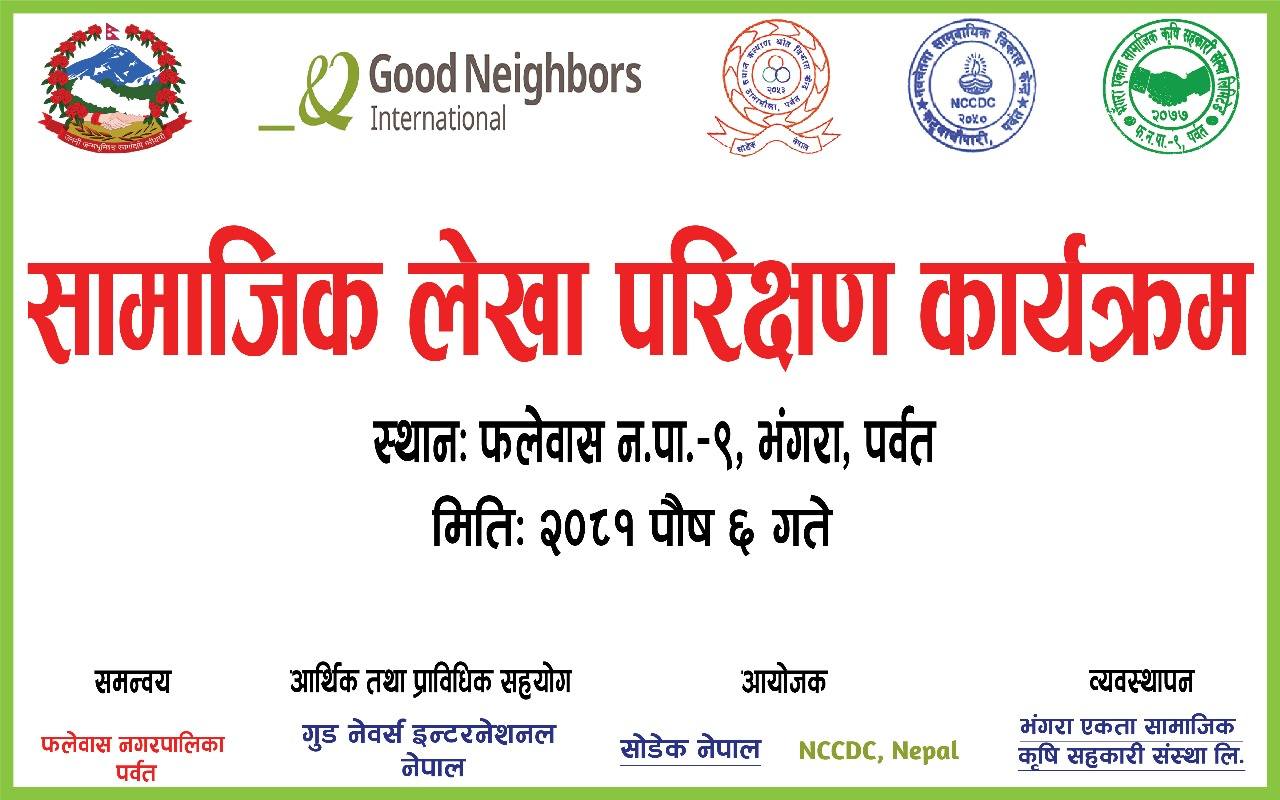 गुुड नेर्वस इन्टरनेशन,नेपालको आर्थिक तथा प्राविधिक सहयोगमा सोडेक नेपाल पर्वत र नवचेतना सामुदायिक विकास केन्द्रले पर्वतमा संचालन गरेको एकिकृत सामुुदायिक परियोजनाको सामाजिक लेखा परिक्षण सम्पन्न भएको हो ।