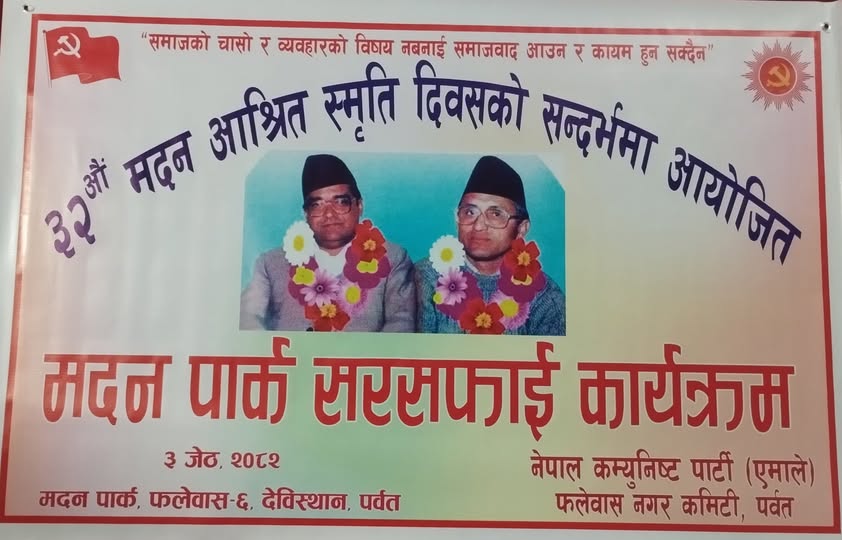 नेपाल कम्युनिष्ट पार्टी (एमाले) का तत्कालीन महासचिव मदन भण्डारी र सङ्गठन विभाग प्रमुख जीवराज आश्रितको ३२औं स्मृति दिवसमा उहाँहरुले गरेको योगदानको स्मरण गर्दैे फलेवासमा रहेको मदन पार्कमा सरसफाई तथा उहाँहरुको नेपाली राजनीतिमा रहेको योगदानको चर्चा गरिएको थियो ।