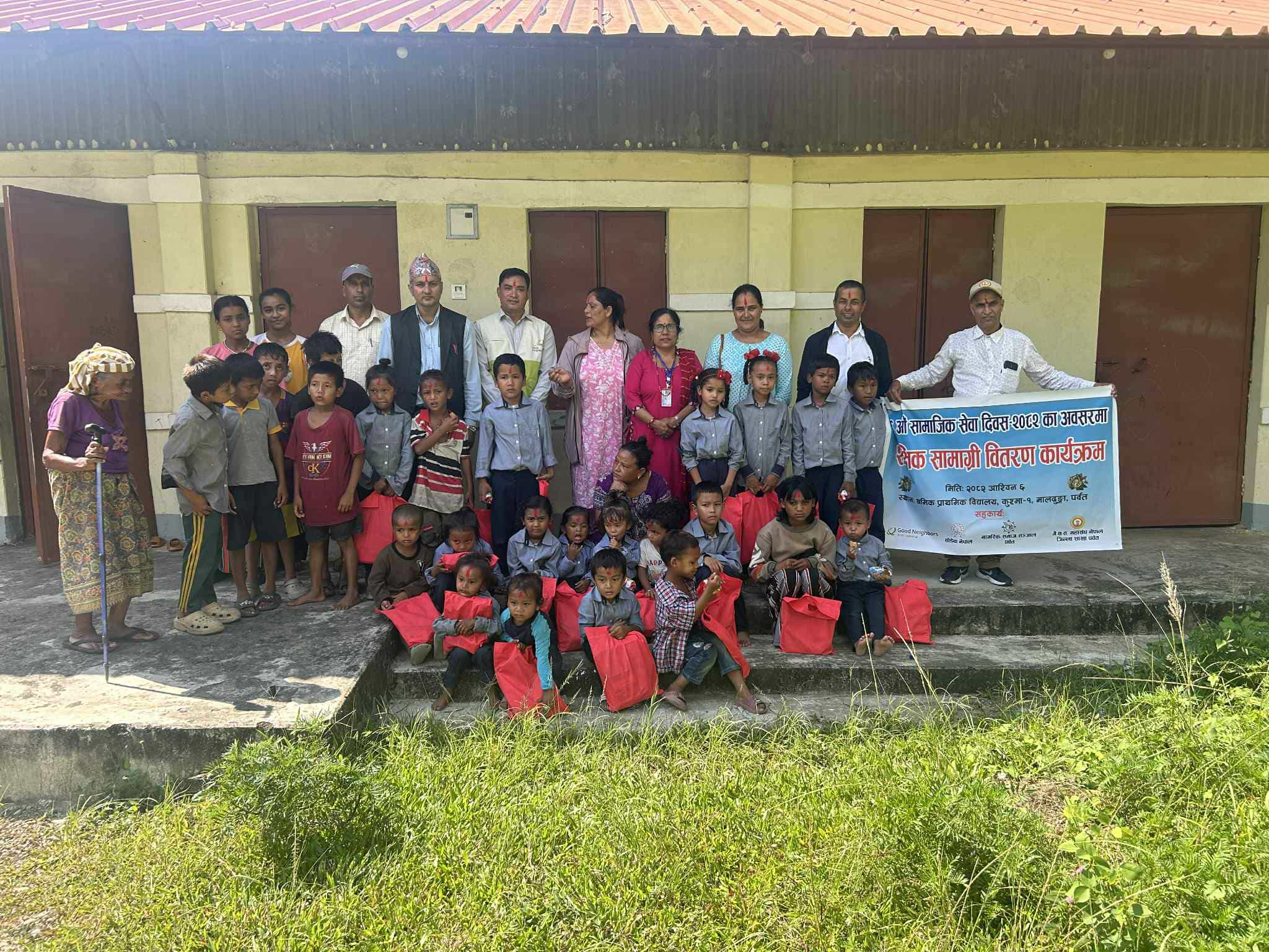 गैरसरकारी संस्था महासंघ नेपाल जिल्ला शाखा पर्वत तथा नागरिक समाज संजाल पर्वतको आयोजना तथा सोडेक नेपाल र गुडनेईवर्स ईन्टरनेशनल नेपालको आर्थिक सहयोगमा ४६ओैं सामाजिक सेवा दिवस २०८२ को अवसरमा कुश्मा नगरपालिका १ मालढुङ्गामा रहेको श्रमिक प्राथमिक विद्यालयका २० जना वालवालिकाहरुलाई शैक्षिक सामाग्री वितरण गरिएको छ ।