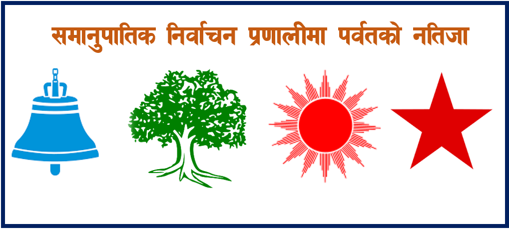 पर्वत : हालै सम्पन्न भएको प्रतिनिधि सभा सदस्य निर्वाचनको मत परिणाममा समानुपातिकतर्फ पर्वतमा पनि राष्ट्रिय स्वतन्त्र पार्टी पहिलो बनेको छ ।